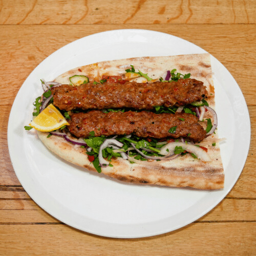 Geserveerd met friet of rijst pilav, whiskeysaus, tzatziki en brood
